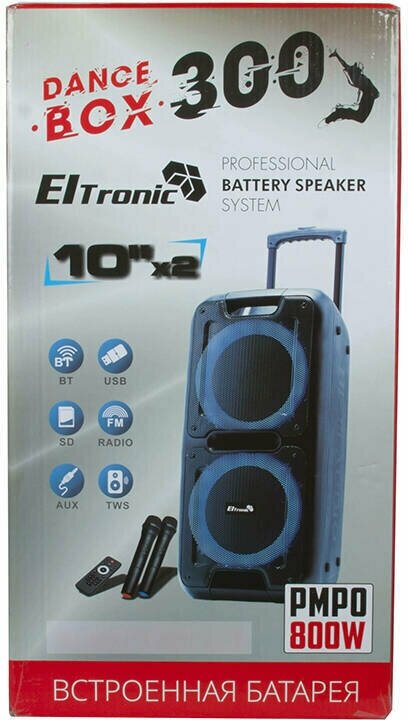Portable speaker Eltronic 20-14 Dance Box 300, wireless microphone 2 pcs., remote control, power cable 220V, connection cable 12V, documentation; TWS function to synchronize two speakers into a stereo system via Bluetooth; telescopic handle