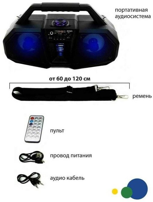 Equipment: portable audio system, USB charging cable, audio cable, carrying strap, remote control, warranty card, instruction in Russian