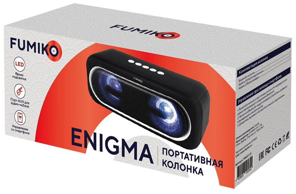 Total power: 10 W, wireless connection: Bluetooth, connectors and interfaces: USB Type-A for a flash drive, audio input mini jack 3.5 mm, features: FM radio, built-in microphone, HandsFree function, microSD support, lighting effects
