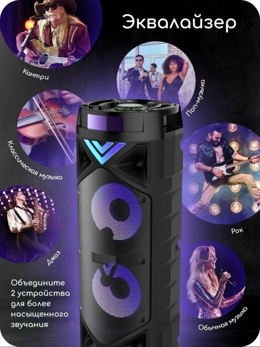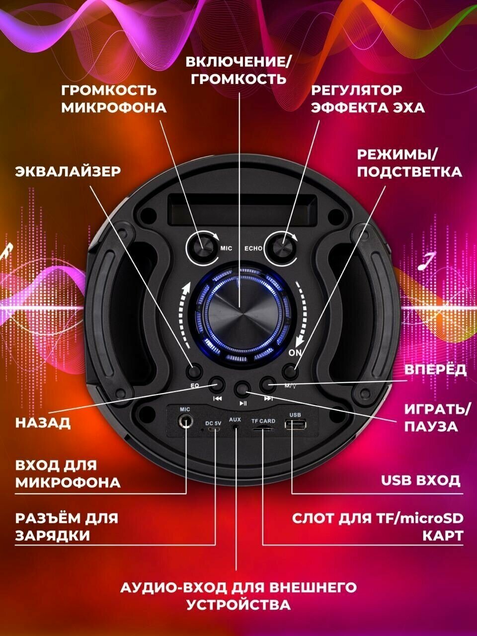 Peculiarities: FM radio, built-in microphone, HandsFree function, display, karaoke, SD support, microSD support, handle, lighting effects