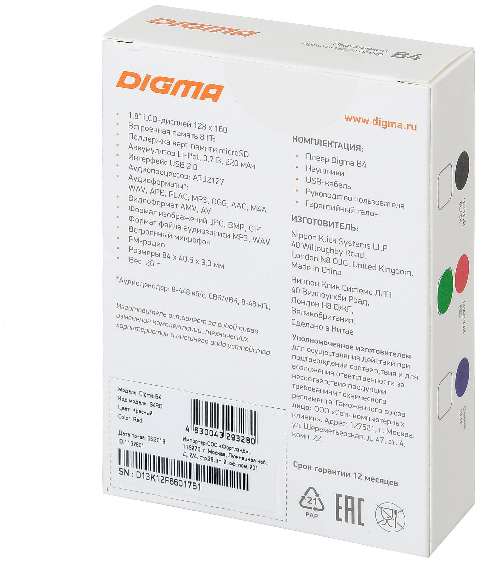 Options and kit: FM tuner, voice recorder, screen, maximum memory card capacity: 128 GB, maximum operating time: 15 hours, audio format support: AAC, APE, FLAC, OGG, PCM, WAV, weight: 26 g