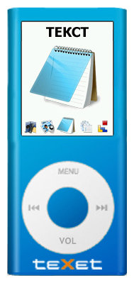 Support for AMV format; headphone jack 2.5mm; accessories: headphones, neck strap, teXet neck strap, software CD, miniUSB->USB adapter, mini USB cable, AC adapter, hands