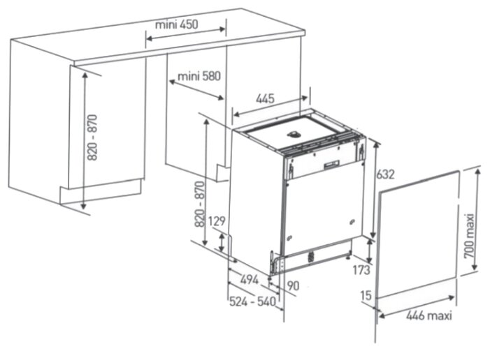 Description: Installation type: fully built-in, type: narrow, width: 45 cm, height: 82 cm, depth: 58 cm, safety: childproof, anti-leak, programs: delicate, intensive, standard, economy, drying type: conden