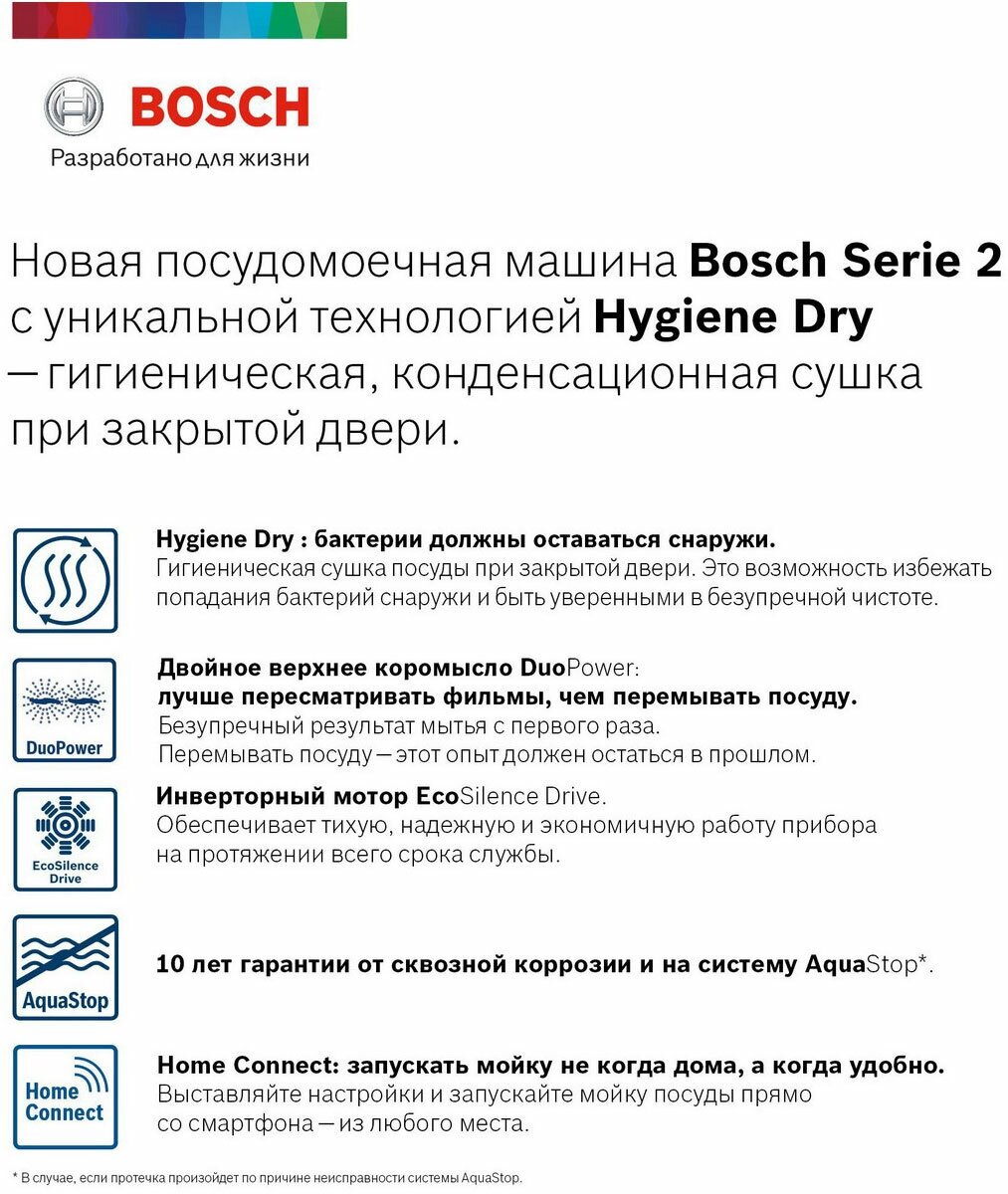 Additional Information: Home Connect technology with Yandex Alice support; Hygiene Dry technology; DuoPower double top rocker; AquaStop system; drying mode ExtraDry; SilenceProgram quiet operation mode; third level loading VarioDrawer; ActiveWater technology; three-component