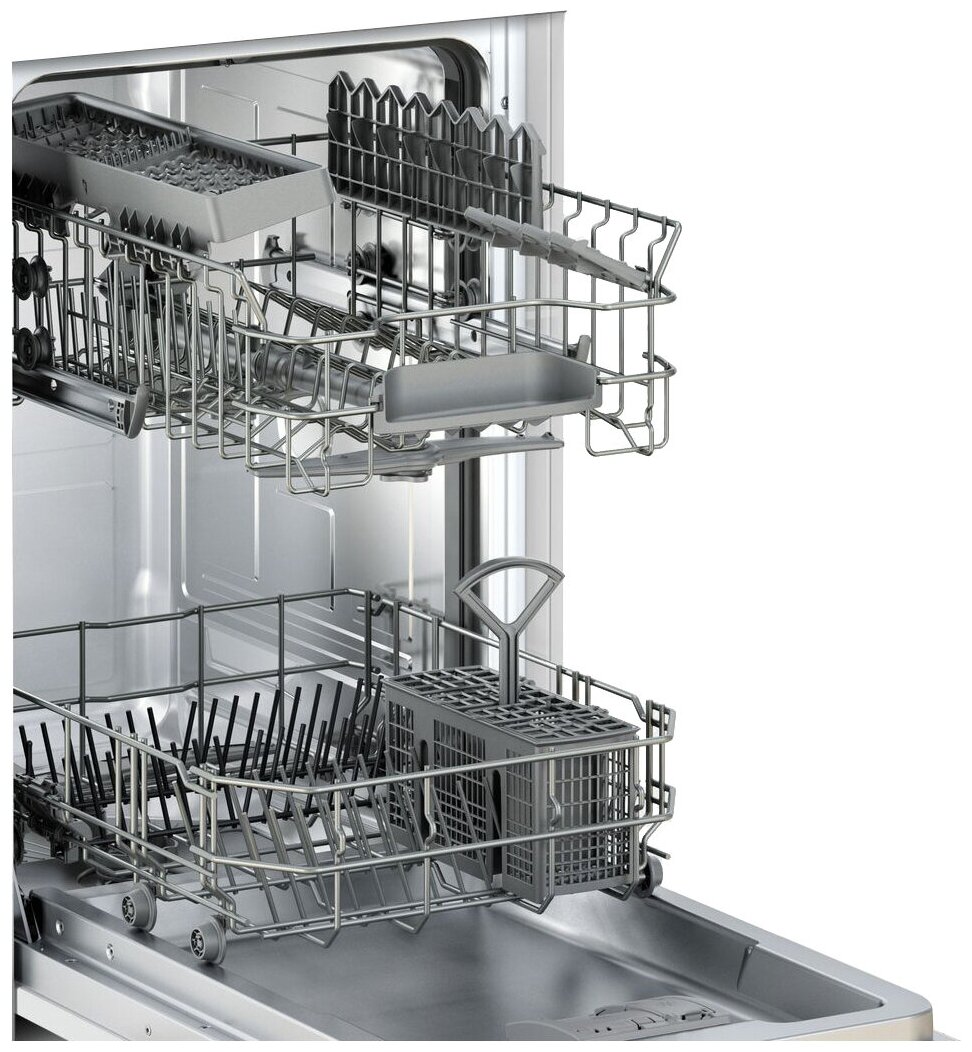 Design features: Automatic water hardness setting, stainless steel interior, 3 in 1 products, height-adjustable basket for dishes, delay timer