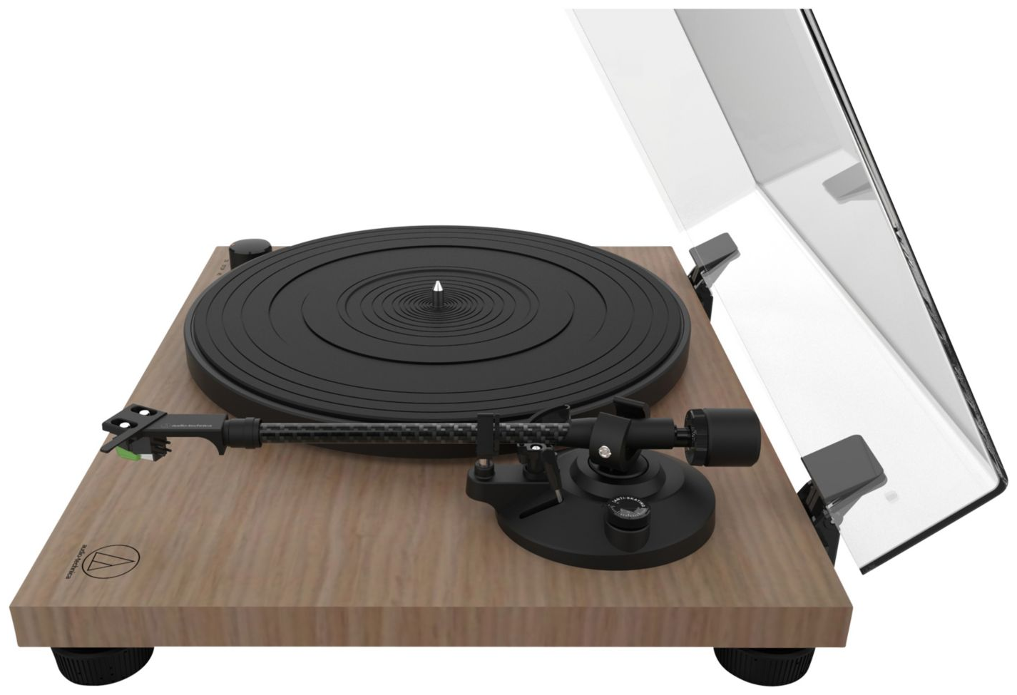 33 and 45 rpm belt drive, electronic shifting, cartridge included, cap included, built-in phono stage, no electronic speed shifting
