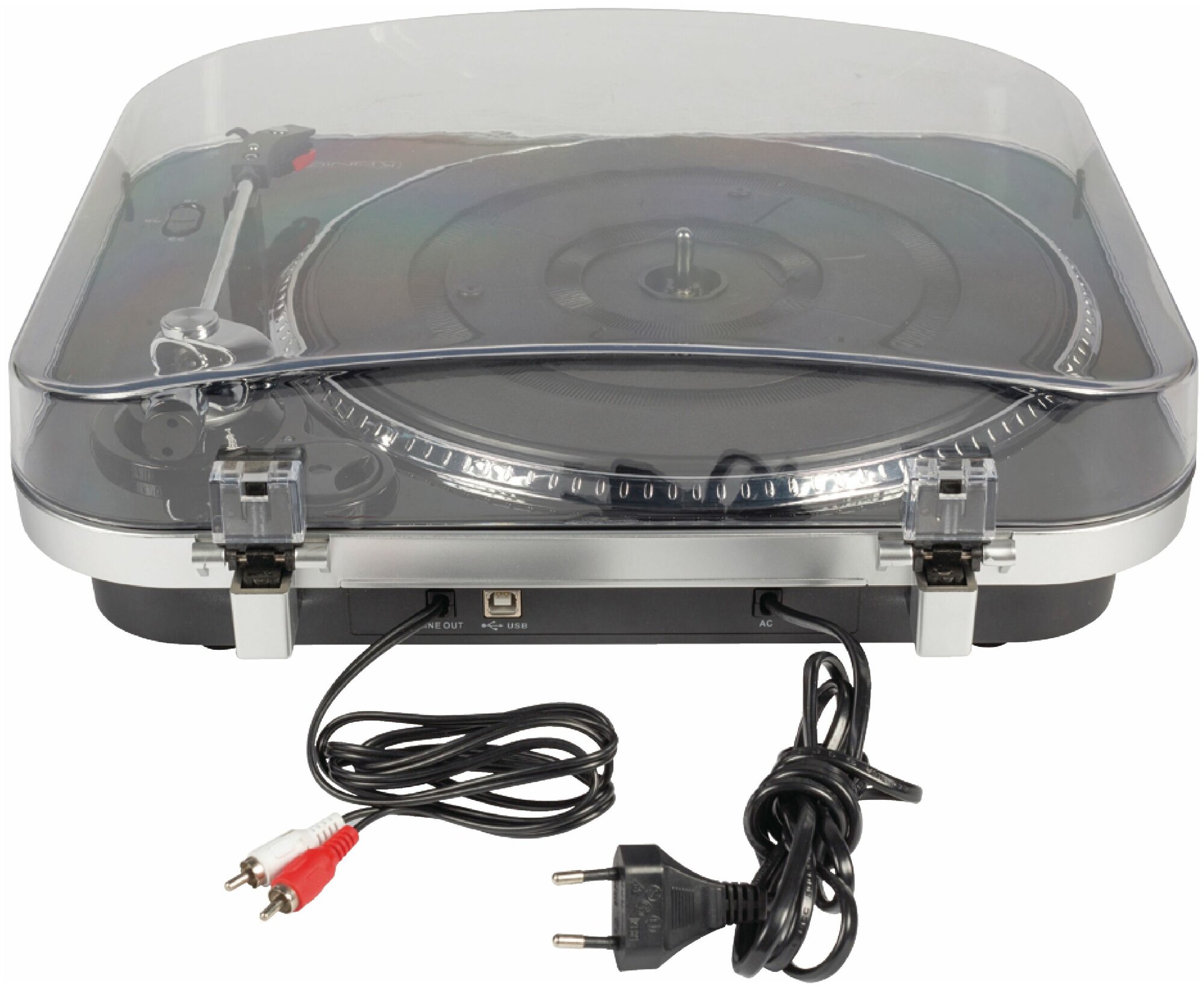 Belt drive, speeds 33, 45 and 78 rpm, electronic switching, cartridge included, cover included, built-in phono stage, electronic speed switching, connection to a computer