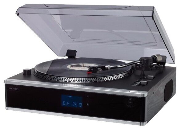 Belt drive speed 33 and 45 rpm, electronic switching, cartridge included, cover included, built-in phono stage, electronic speed switching, built-in acoustics