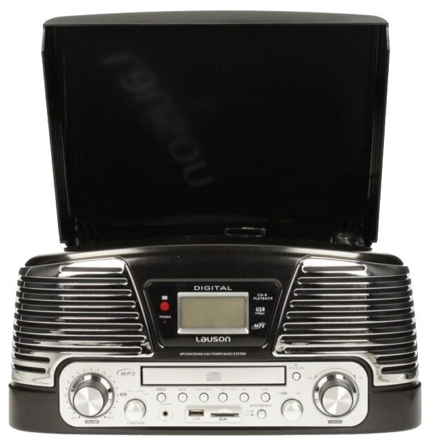 Belt drive, speeds 33, 45 and 78 rpm, electronic switching, cartridge included, cover included, built-in phono stage, electronic speed switching, built-in acoustics