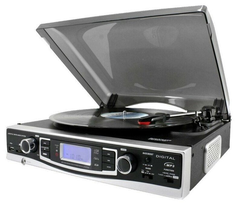Belt drive, speeds 33, 45 and 78 rpm, cartridge included, cover included, built-in phono stage, hitchhiking, built-in acoustics