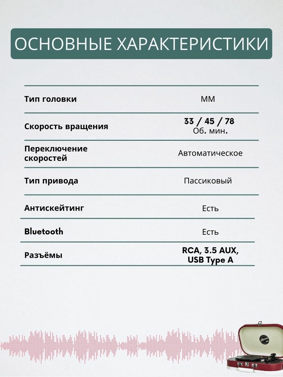 Belt drive, speeds 33, 45 and 78 rpm, electronic switching, cartridge included, cover included, built-in phono stage, electronic speed switching, autostop, built-in acoustics