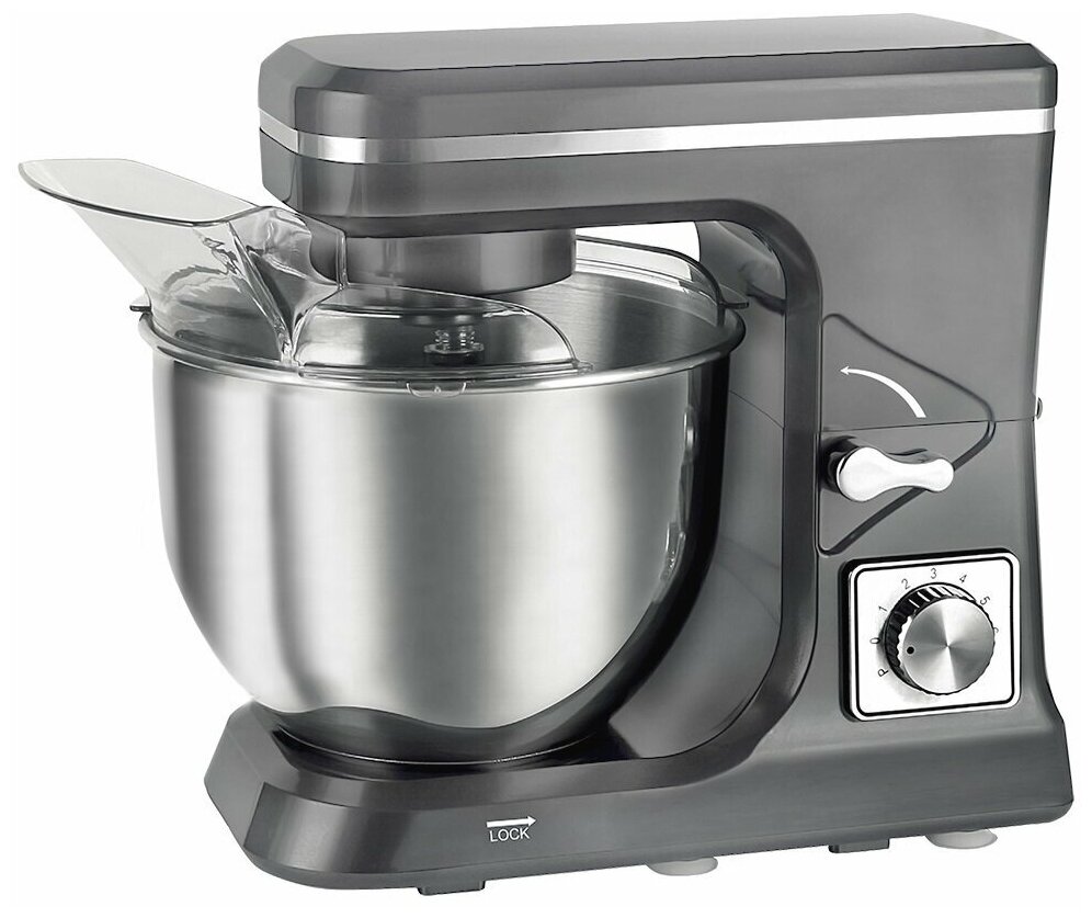 Type: planetary mixer, bowl/glass volume: 5 l, number of speeds: 6, maximum rotation speed: 186 rpm, impulse mode, power: 1000 W, height: 43 cm, width: 25.50 cm, depth: 36 cm