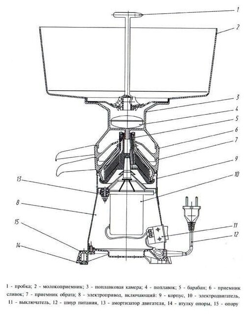 Milk receiver assembly, drum assembly, housing assembly with electric drive, float chamber, float, cream receiver, skim milk receiver, cork, passport, spare parts and accessories Spare parts and accessories: sealing ring, class
