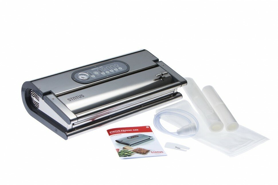 - vacuum sealer;<br/> - roll 28 x 300 cm;<br/> - roll 35 x 300 cm;<br/> - 5 bags 20 x 28 cm;<br/> - 5 bags 12 x 55 cm;<br/> - 5 double-sided adhesive tapes Status Stiki;<br/> - vacuum tube;<br/> - manual cutter.