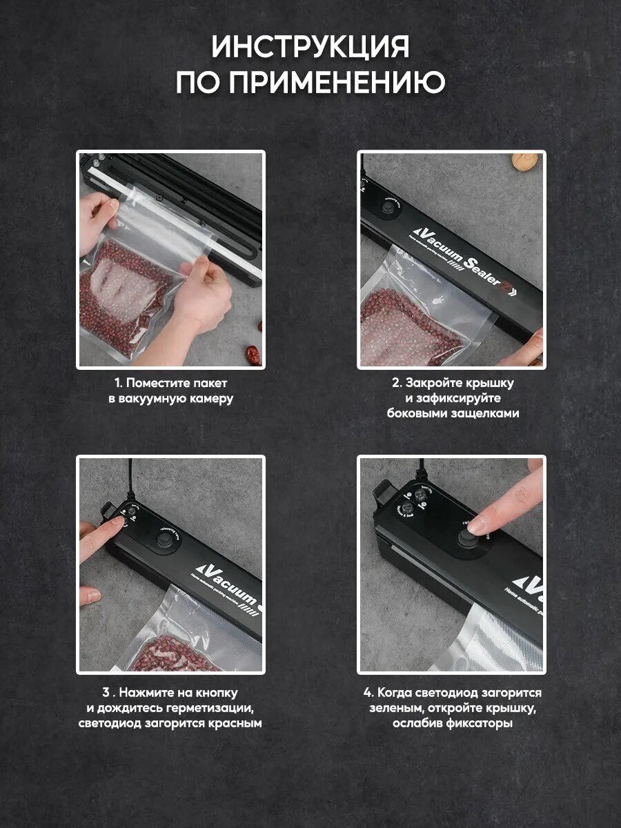 Type: vacuum sealer, purpose: vacuuming, packaging, body material: plastic, non-slip feet, display, control: mechanical