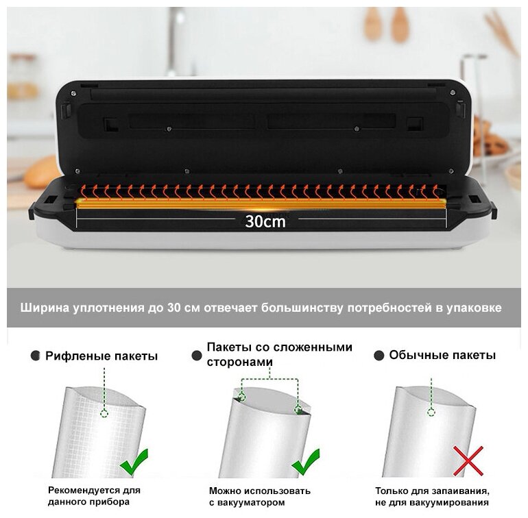 Type: vacuum sealer, purpose: vacuuming, packaging, body material: plastic, non-slip feet, control: electronic