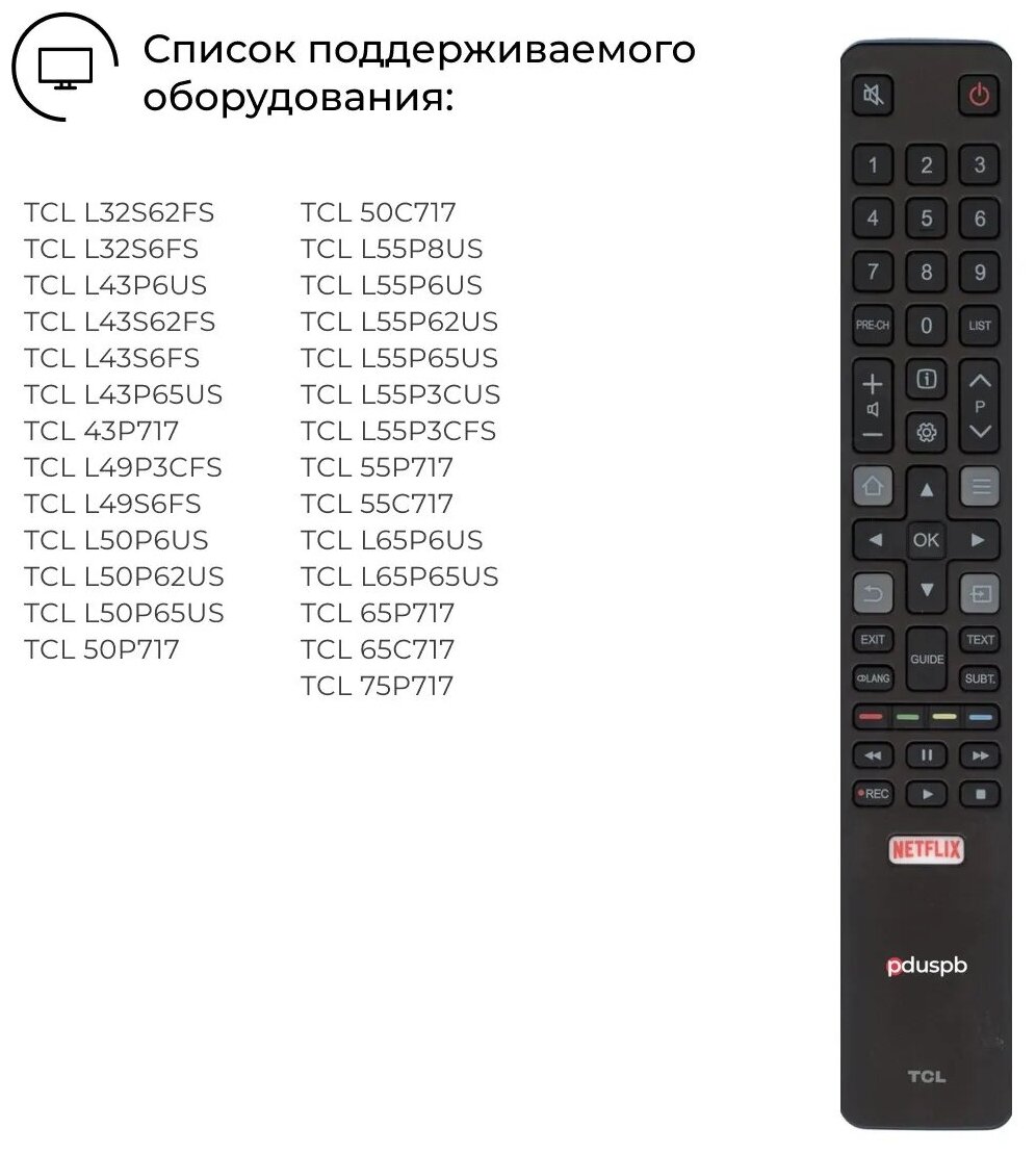 TCL L32S62FS, L32S6FS, L43P6US, L43S62FS, L43S6FS, L43P65US, 43P717, L49P3CFS, L49S6FS, L50P6US, L50P62US, L50P65US, 50P717, 50C717, L55P8US, L55P6US, L55P62US, L55P65US, L55P3CUS, L55P3CFS, 55P717, 55C717, L65P6US, L65P65US, 65P717, 65C717, 75P717