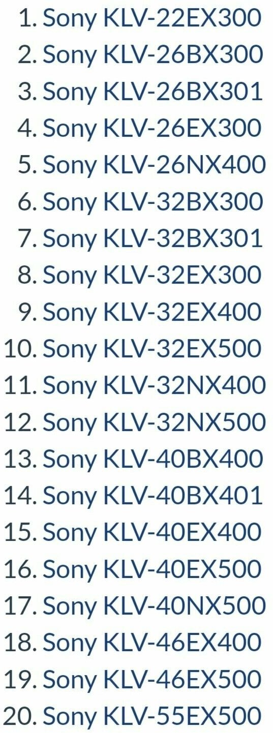 KLV-22EX300, KLV-26BX300, KLV-26BX301, KLV-26EX300, KLV-26NX400, KLV-32BX300, KLV-32BX301, KLV-32EX300, KLV-32EX400, KLV-32EX500, KLV-32NX400, KLV-32NX500, KLV-40BX400, KLV-40BX401, KLV-40EX400, KLV-40EX500, KLV-40NX500, KLV-46EX400, KLV-46EX500, KLV-55EX