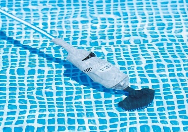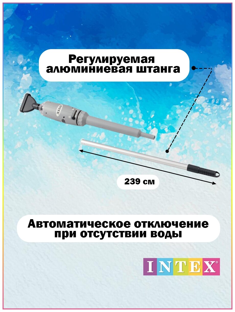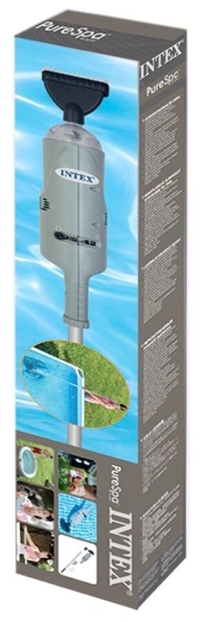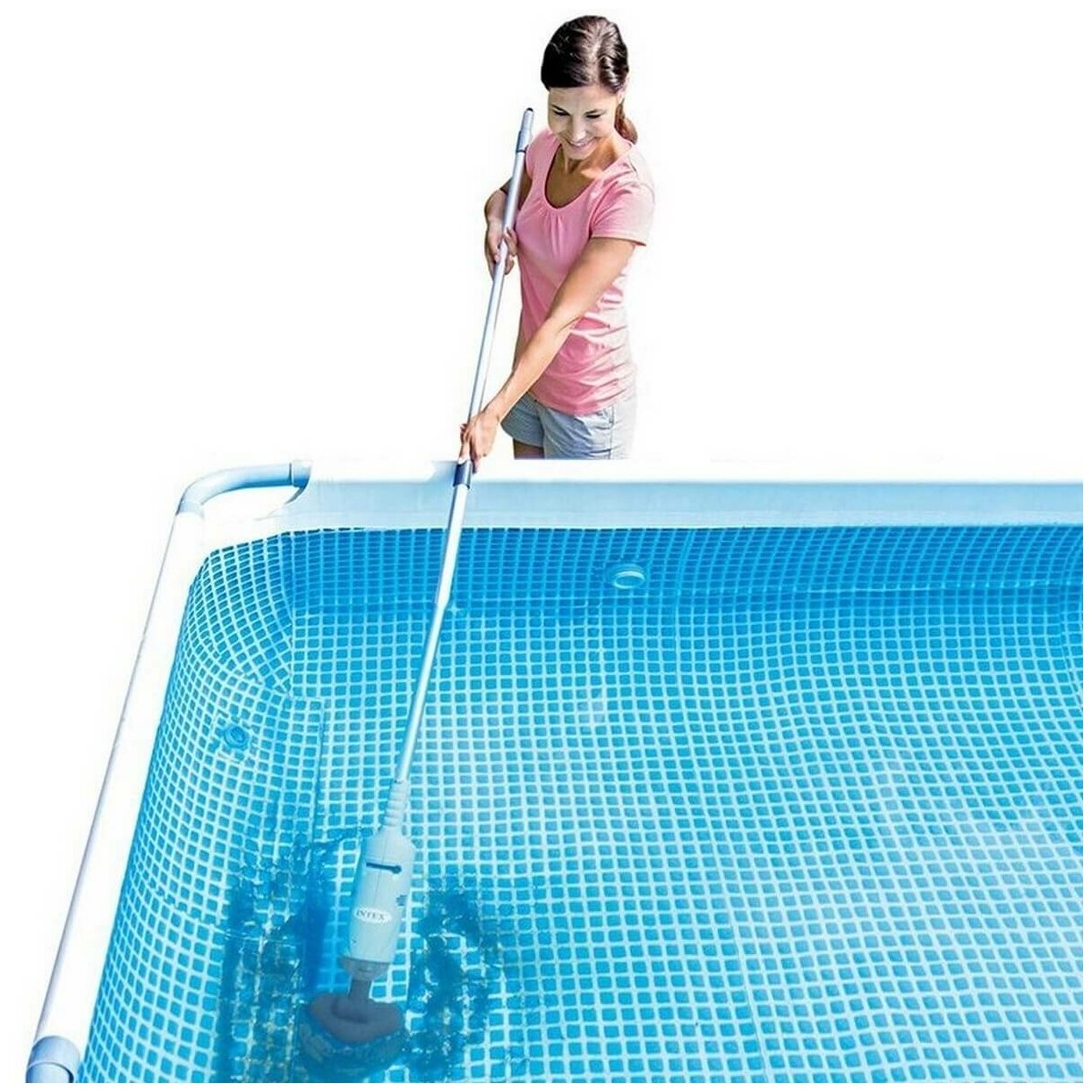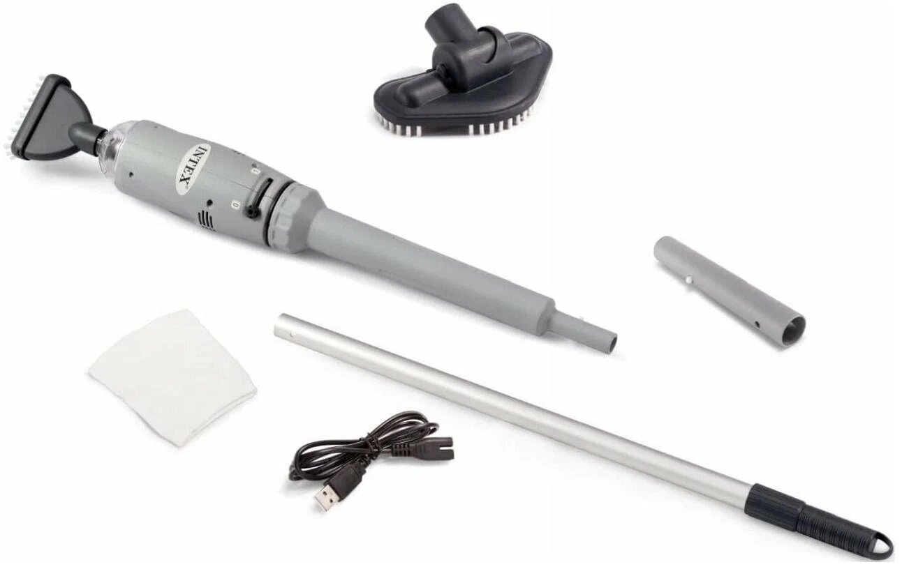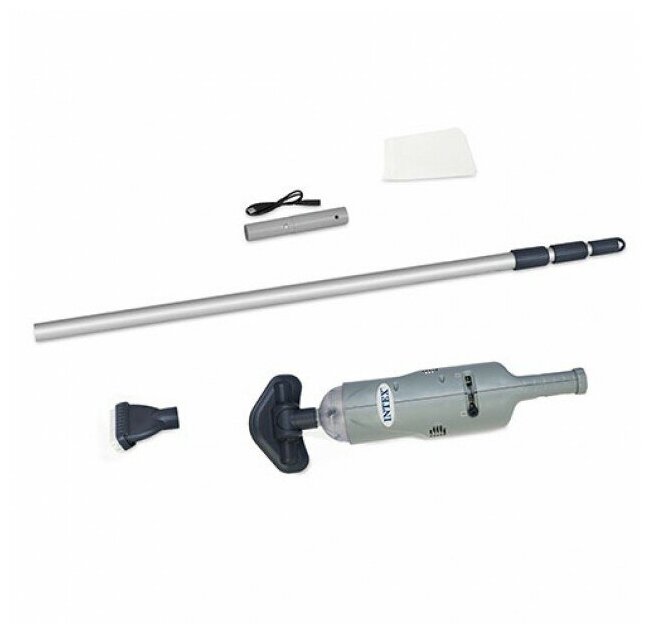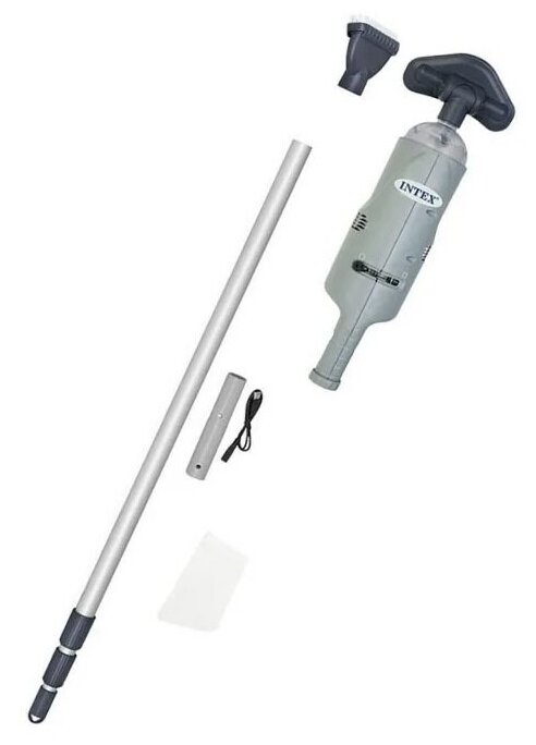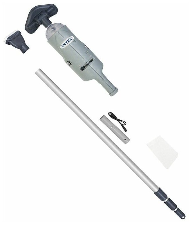 Detailed equipment: Pool vacuum cleaner with intex battery; two interchangeable brush heads; telescopic handle 236 cm; user manual; branded packaging