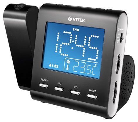 24 hour time format, blue backlight, sound level control, digital frequency display, radio/signal alarm, alarm setting for different types of days, projector with 180-degree rotation and focus function
