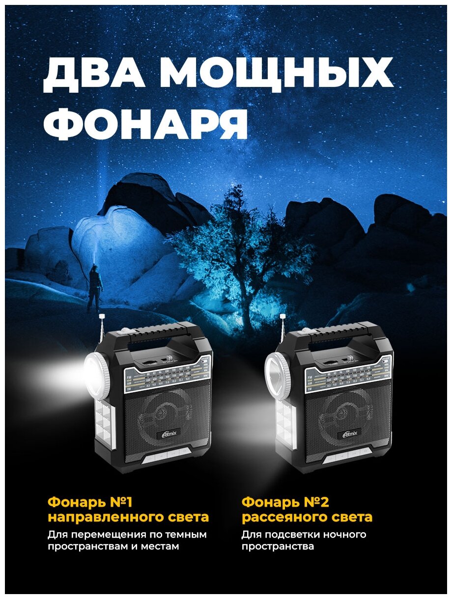 Built-in battery, two LED lights, USB-connector for recharging mobile devices