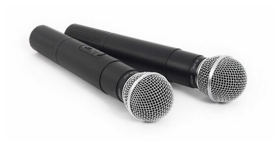 Power supply, audio cable Jack 1/4"–Jack 1/4", receiver, 2 handheld transmitters, instructions