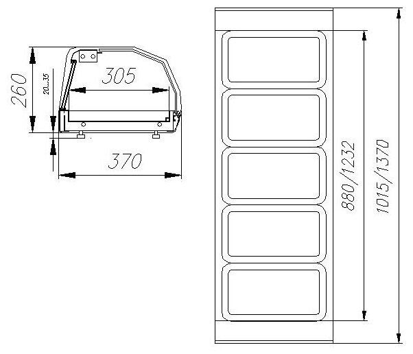Capacity - 5 gastronorm containers GN 1/3, exposition area - 880x305 mm