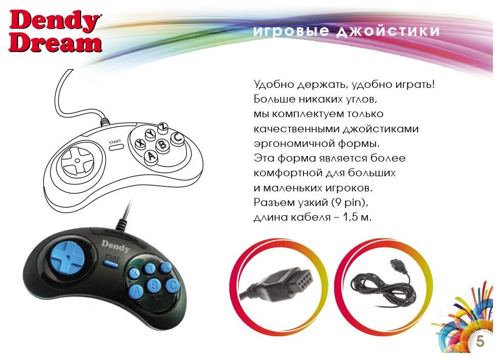 1. Game console - 1 pc. 2. Joysticks - 2 pcs. 3. Power supply 9 V - 1 pc. 4. AV Dendy RCA cable - 1 pc. 5. Instruction manual - 1 pc.