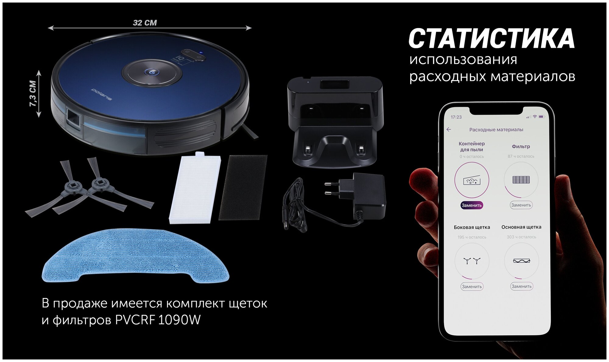 Additional Information: Cleaning area per charge 150 m², set includes: dust collector installed - 1 pc.; container for wet cleaning with a rag - 1 pc.; Accumulator battery - installed - 1 pc.; base for charging - 1 pc.; AAA batteries are included