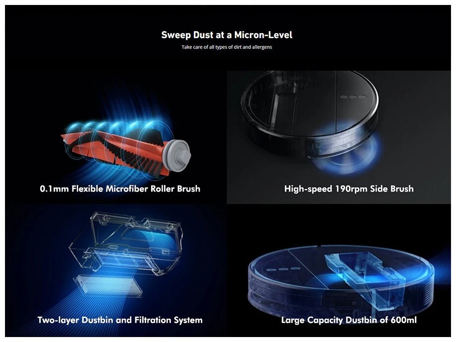 Built-in clock, gyroscope, elevation sensor, lidar, soft bumper, horizontal parking