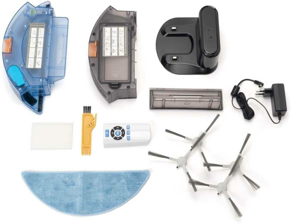 Cleaning time programming; setting the trajectory of movement; elevation sensors; pollution sensors; HEPA filter; complete set: charging station, container for wet cleaning, container for dry cleaning, remote control D