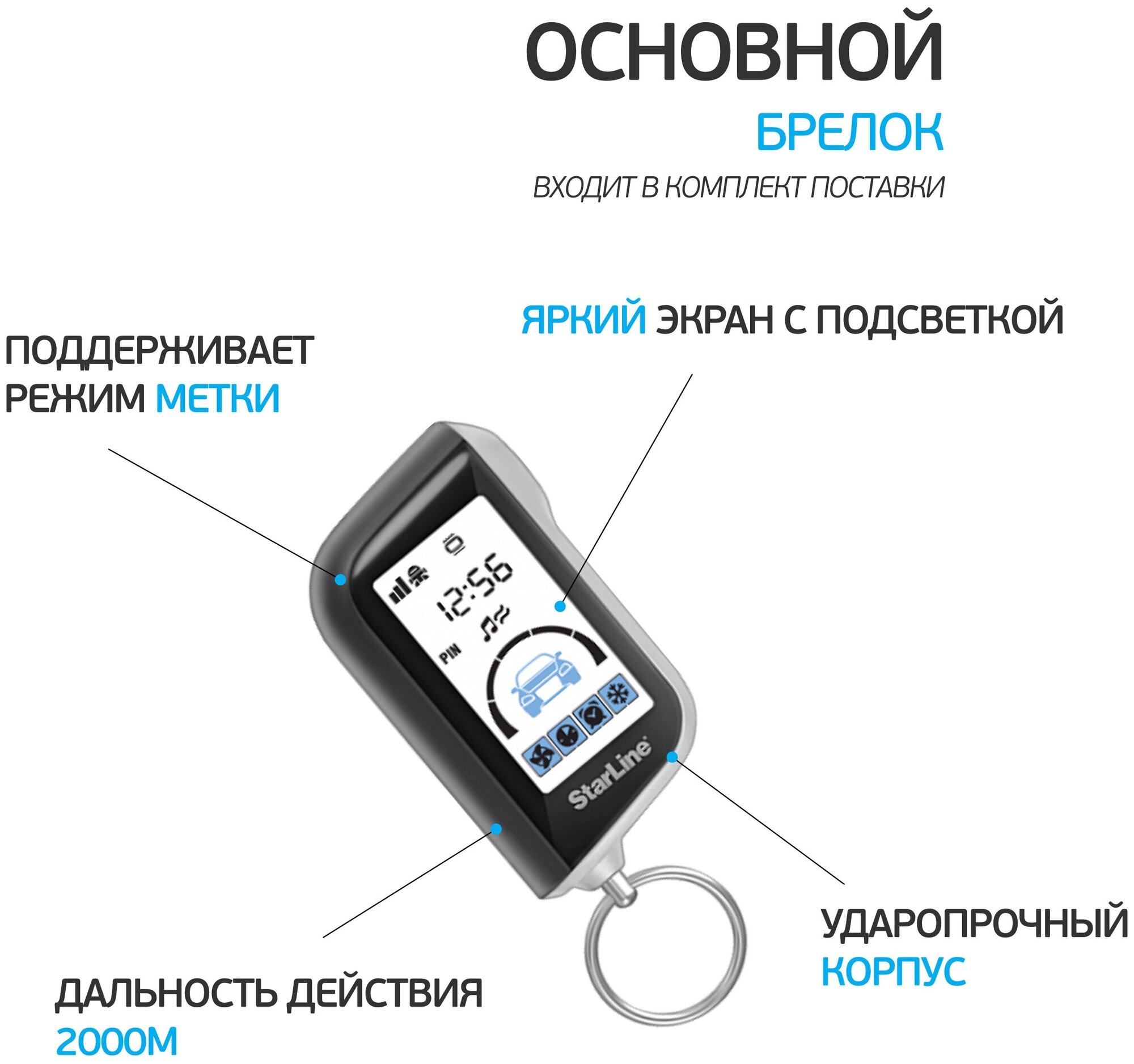 Type of communication: GPS, radio communication, Radio, type of communication with key fob: with feedback, auto engine start: by set time, by temperature, security functions: engine blocking, immobilizer mode, silent security, service functions