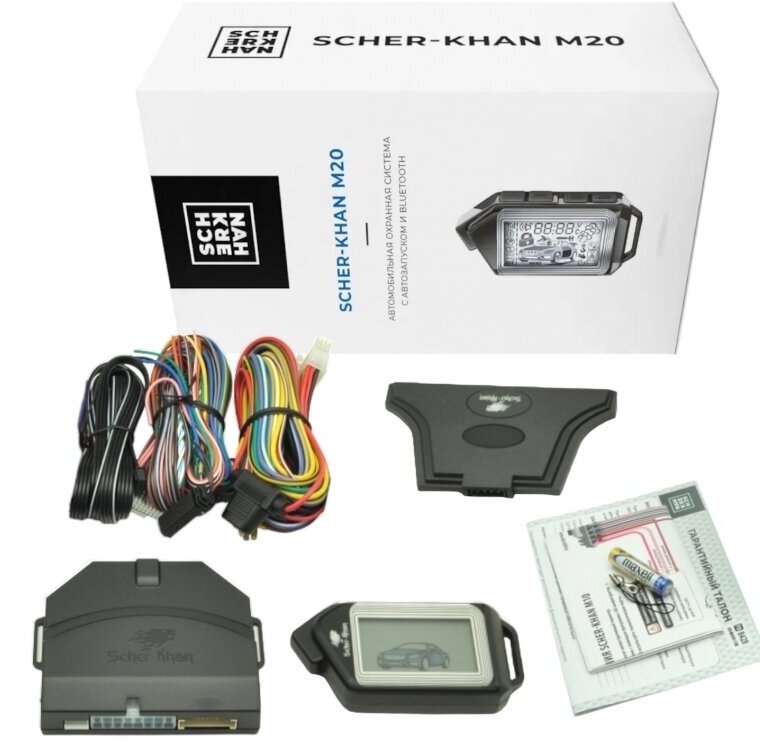 Information sheet, warranty card, installation diagram, processor unit, key fob with LCD display, 16-pin connector with cable and 2 A fuse, 22-pin connector with low-current connection cable