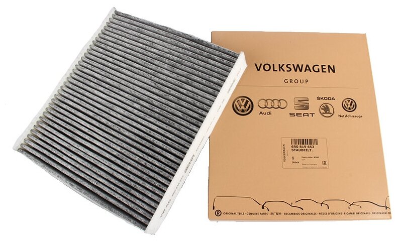 Car brand: Audi, SEAT, Skoda, Volkswagen, car model: Audi A1, Seat Ibiza, Seat Toledo, Skoda Fabia, Skoda Rapid, Skoda Roomster, Volkswagen Fox, Volkswagen Polo, analogue: 6R0819653, length: 254 mm, width: 224 mm, thickness: 36 mm, filter material: carbon