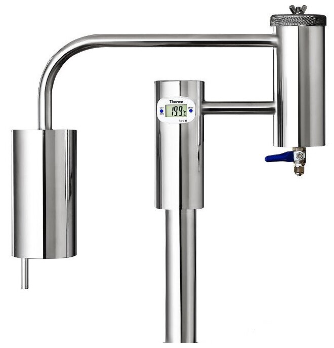 Distillation cube, Distiller Klamp Ø 1.5, Silicone gasket Ø 1.5, Digital thermometer, Alcohol meter, Distillery tap for stillage from 20 liters, Recipe book, Removable heating element, Branded box.