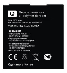 Phone manufacturer: BQ, compatible models: BQ 5022 Bond, capacity: 2300 mAh