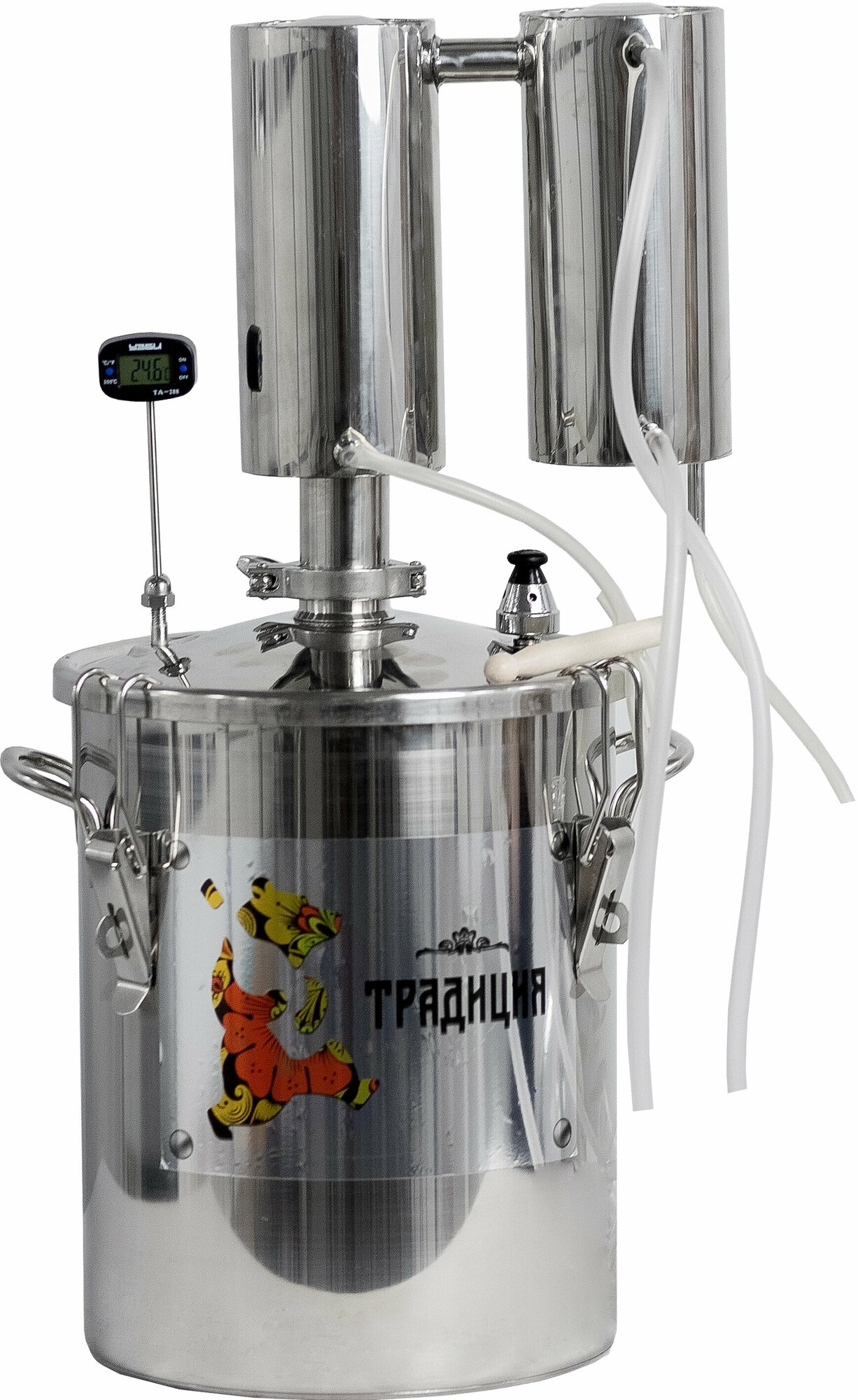 Tank with a volume of 14 l - 1 pc., Removable cover - 1 pc., Superstructure No. 2 - 1 pc., Safety valve - 1 pc., Thermometer - 1 pc., Cold water inlet-outlet pipe 10 m - 1 pc. , a tube for the exit of the finished product and the drain of the steamer