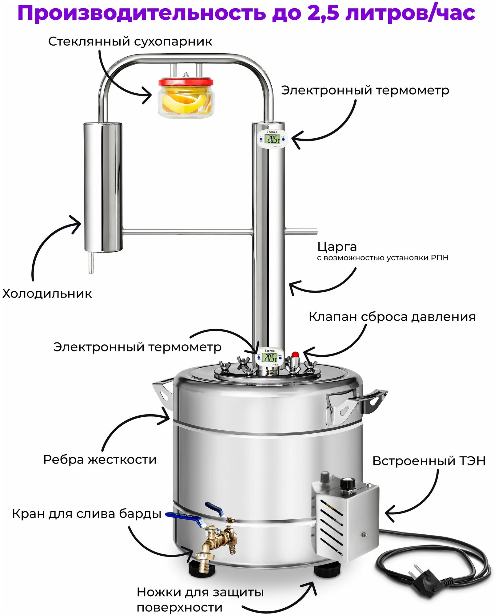 Type: moonshine still, body material: stainless steel, with dryer, heating features: built-in heating element, suitable for induction cookers