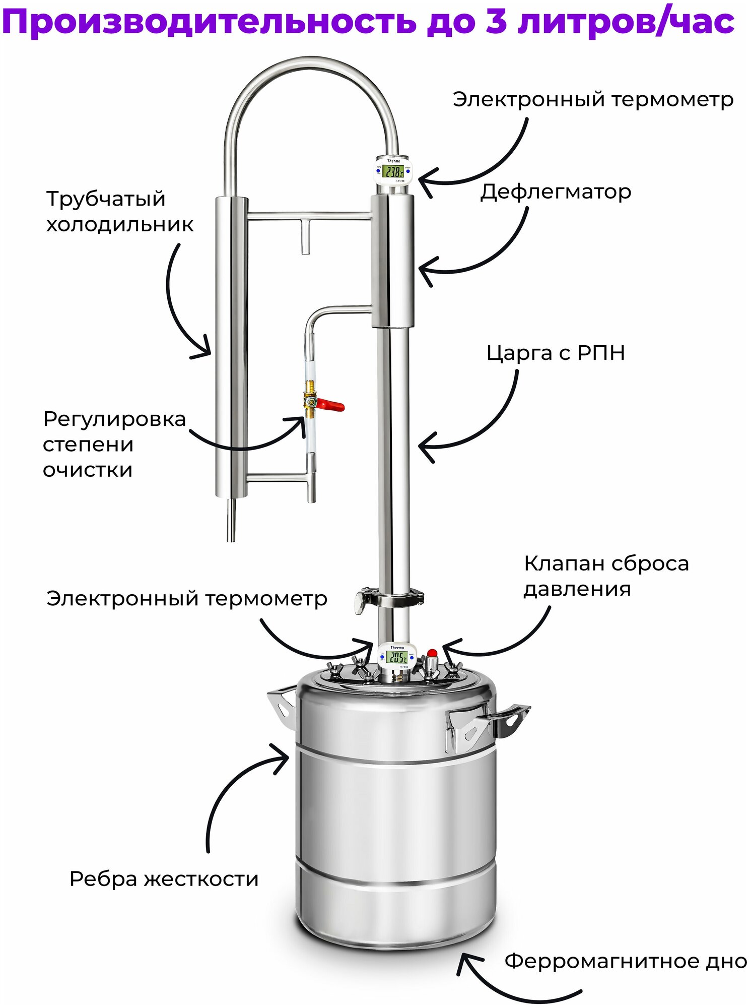 Tsarga with a regular Panchenkov nozzle; dephlegmator; strength control valve; clamp connections; two thermometers: in the tank and on the side