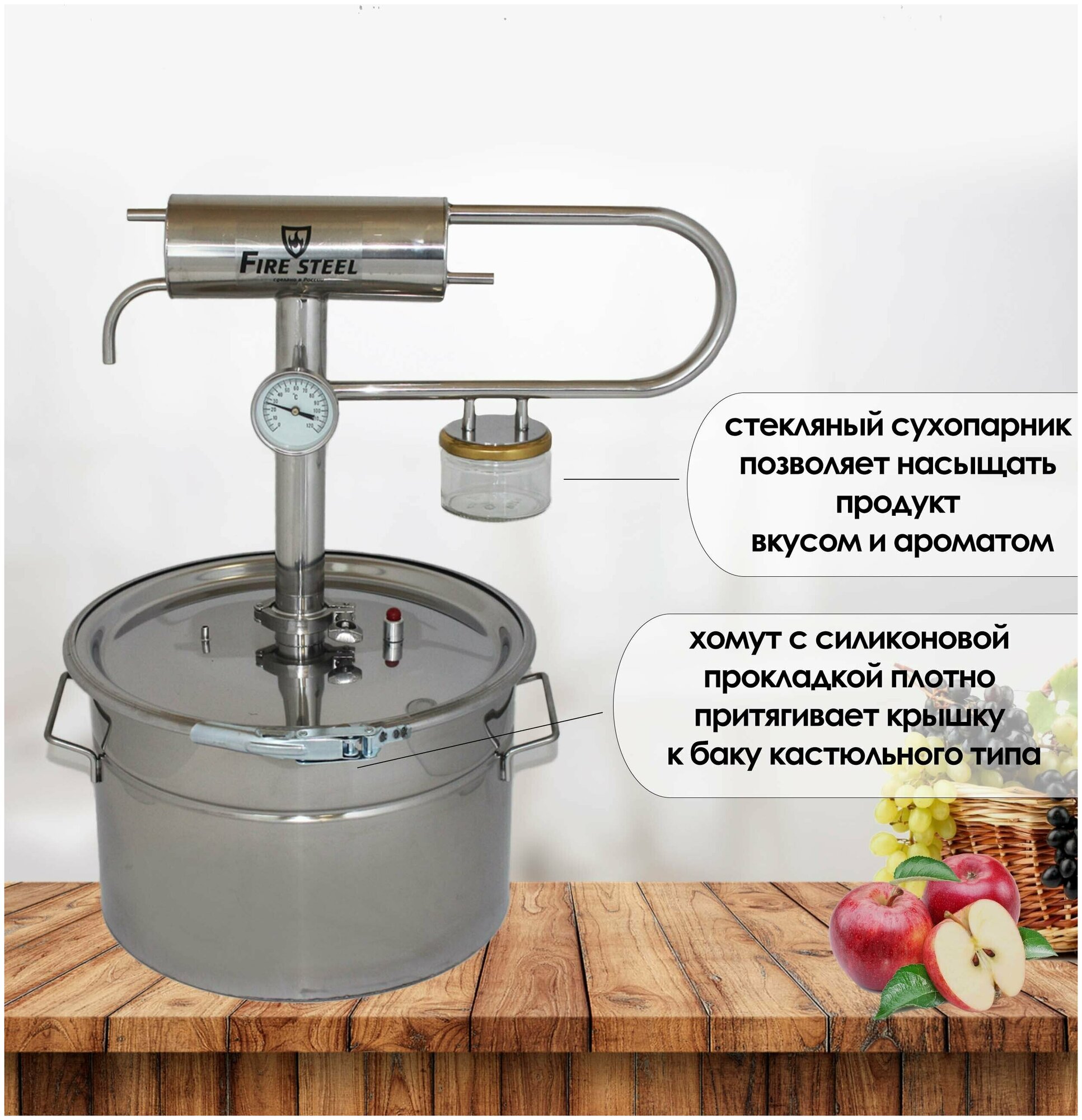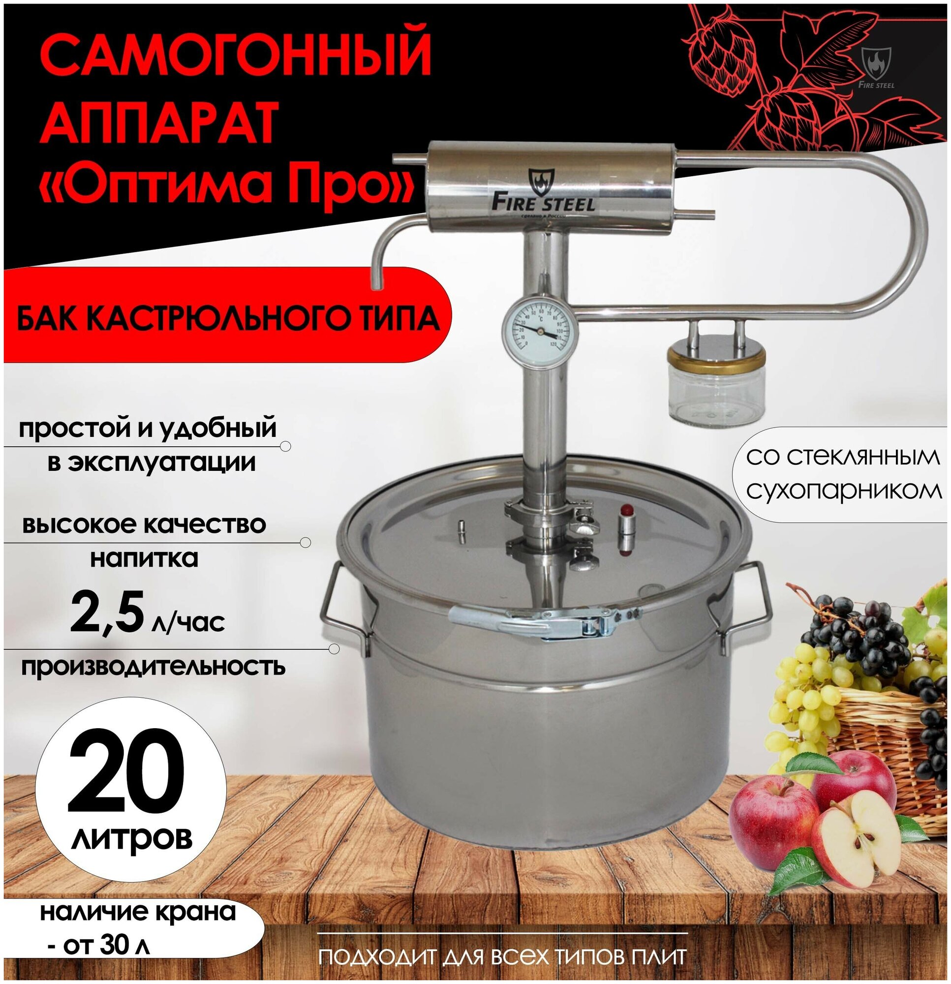 "FIRE STEEL" Compact Optima Pro with a glass steamer and a 20l pot-type tank.