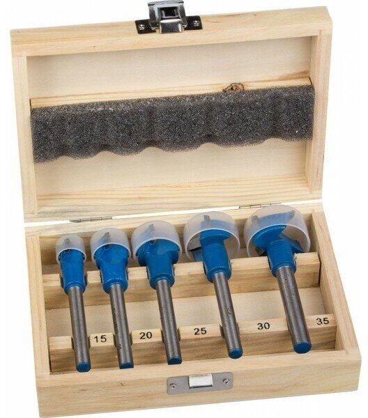 Standard sizes: Forstner for wood 15x8x90, 20x8x90, 25x8x90, 30x10x90, 35x10x90 mm, shank type: cylindrical, quantity in the package: 5 pcs., drill material: VK8, for wood