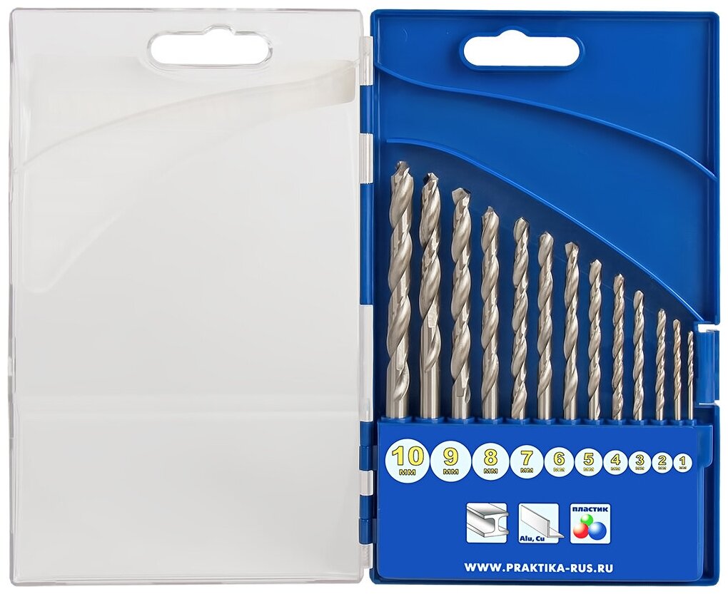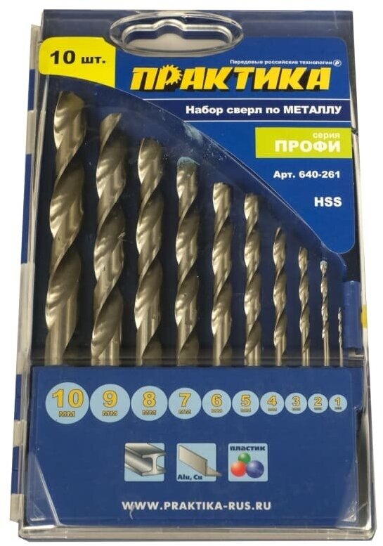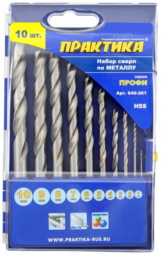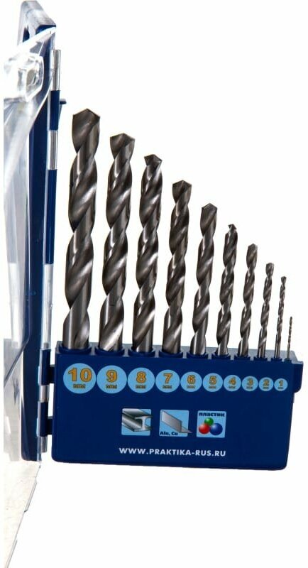 Standard sizes: for metal 1, 2, 3, 4, 5, 6, 7, 8, 9, 10 mm, shank type: cylindrical, quantity in a set package: 10 pcs., drill material: HSS, for metal