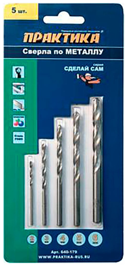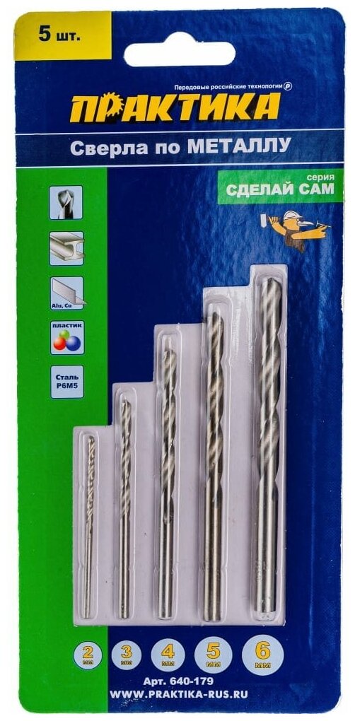 Standard sizes: for metal 2, 3, 4, 5, 6 mm, shank type: cylindrical, quantity per set per package: 5 pcs., drill material: HSS, for metal