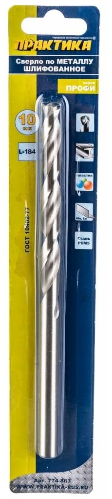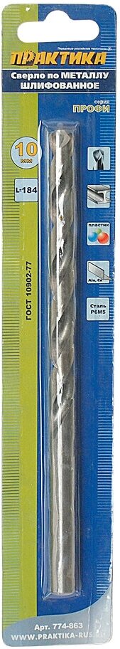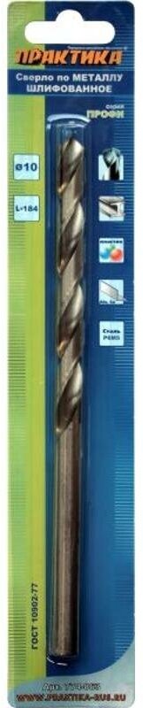 Equipment: piece, dimensions: 10x125x184 mm, shank type: cylindrical, quantity in a set package: 1 pc., drill material: HSS, sharpening angle: 118 degrees, for metal