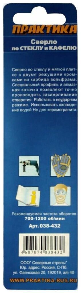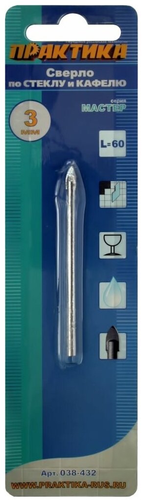 Equipment: piece, dimensions: 3x62 mm, shank type: cylindrical, quantity in the set package: 1 pc., drill material: HSS, for ceramic tiles, for glass