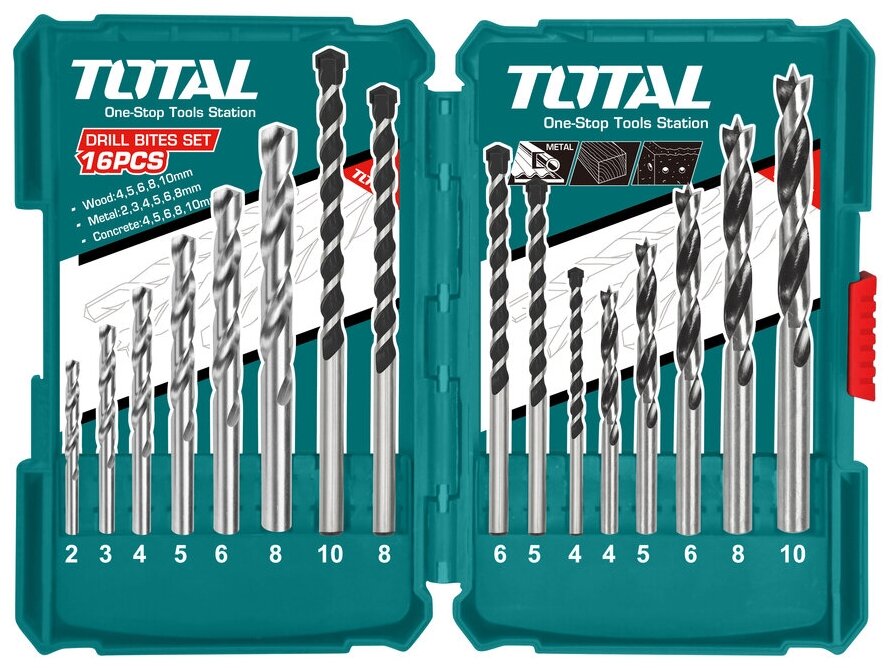 Standard sizes: concrete drill 4; 5; 6; 8; 10; metal drill 2; 3; 4; 5; 6; 8; wood drill 4; 5; 6; 8; 10 mm, quantity in a set package: 16 pcs., for concrete, for wood, for metal