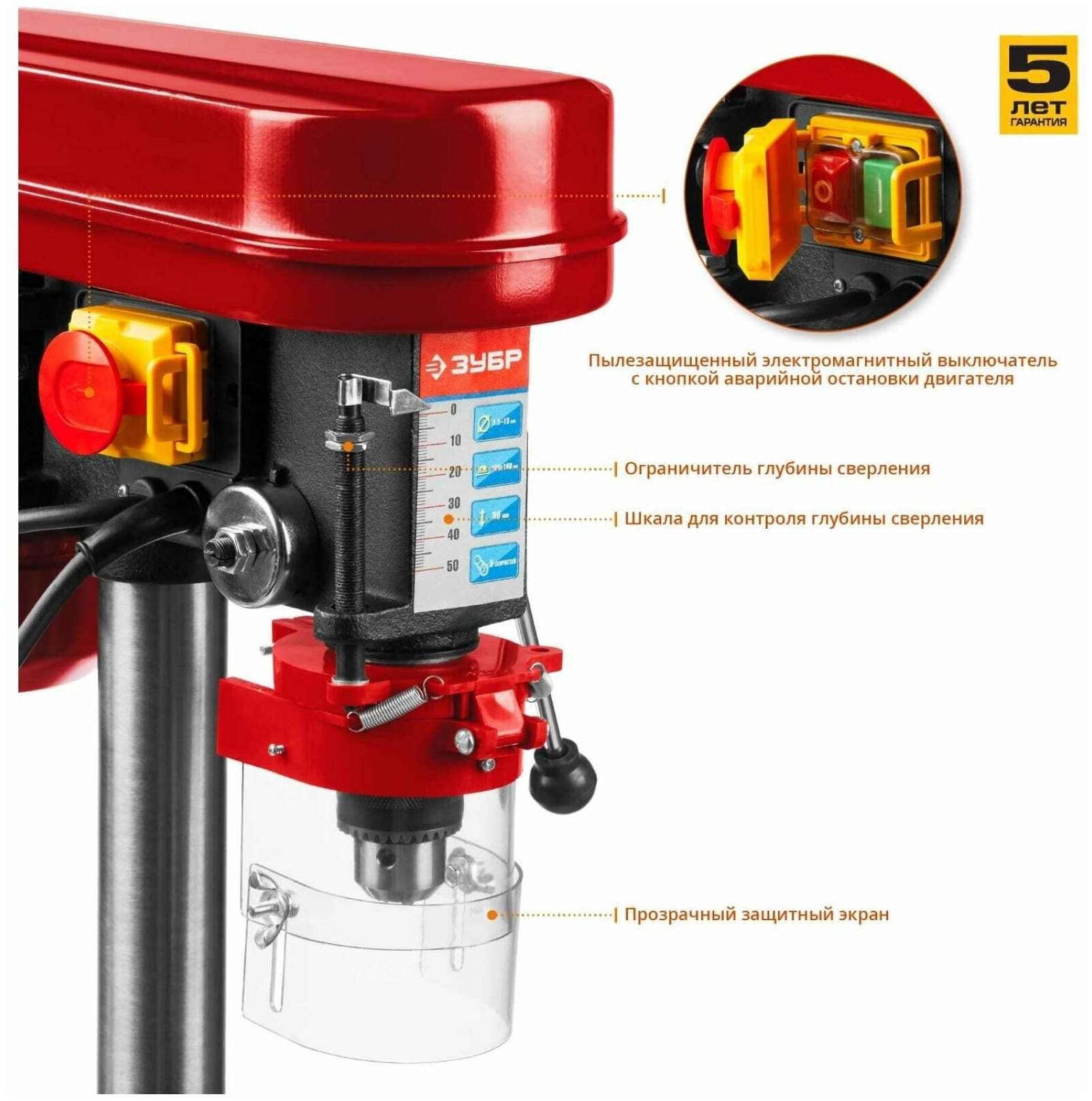 Type of machine: vertical drilling, number of revolutions: 2430 rpm, number of speeds: 5, maximum drill diameter: 13 mm, maximum spindle overhang: 127 mm, installation: desktop, options: protective glass, laser, laser