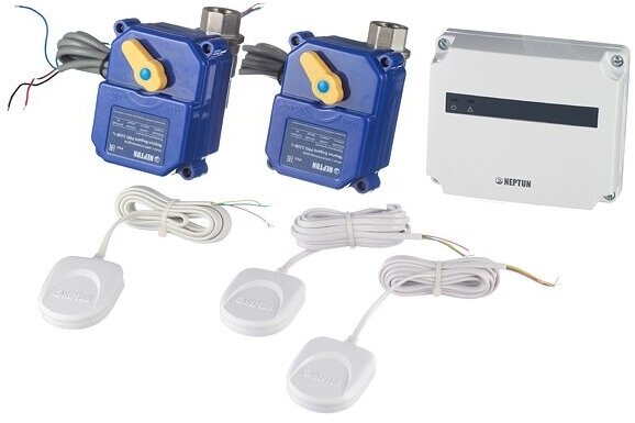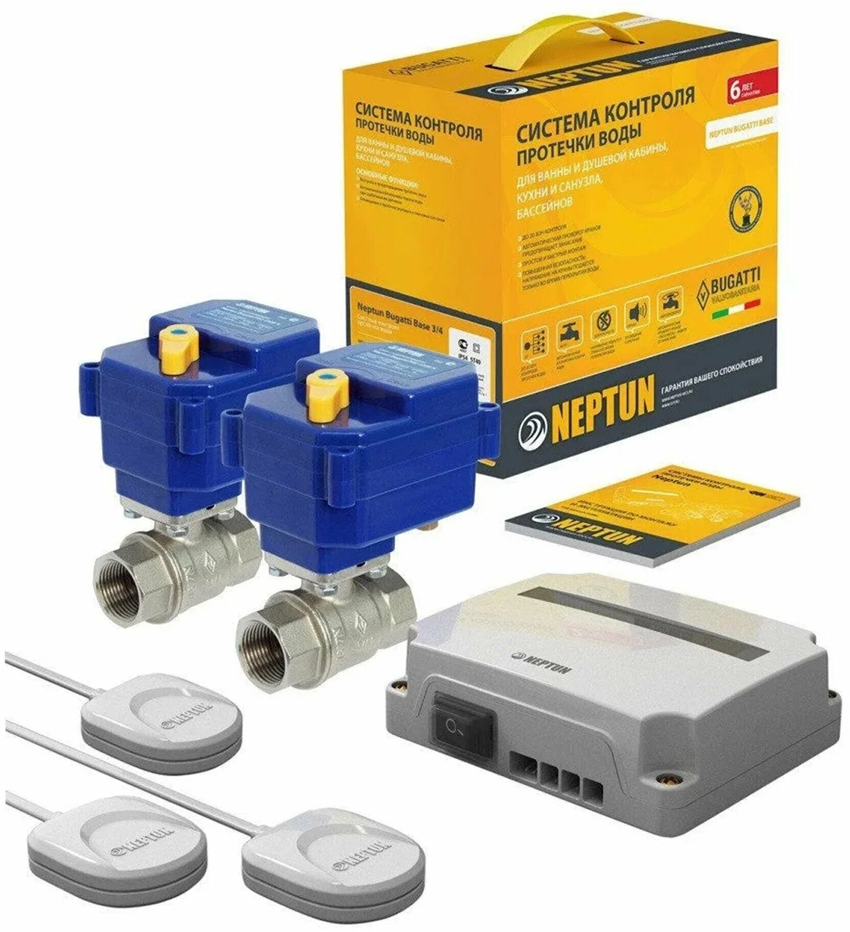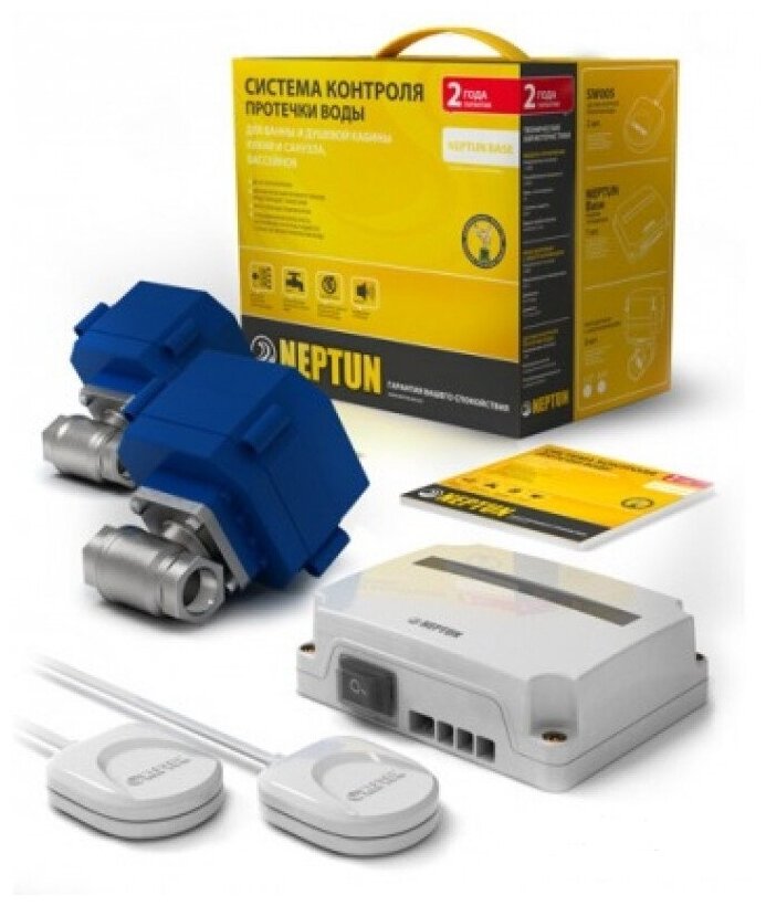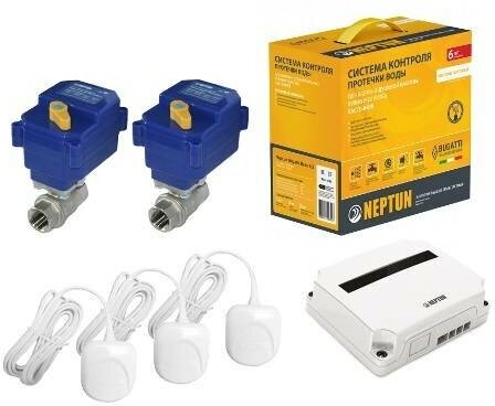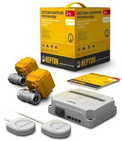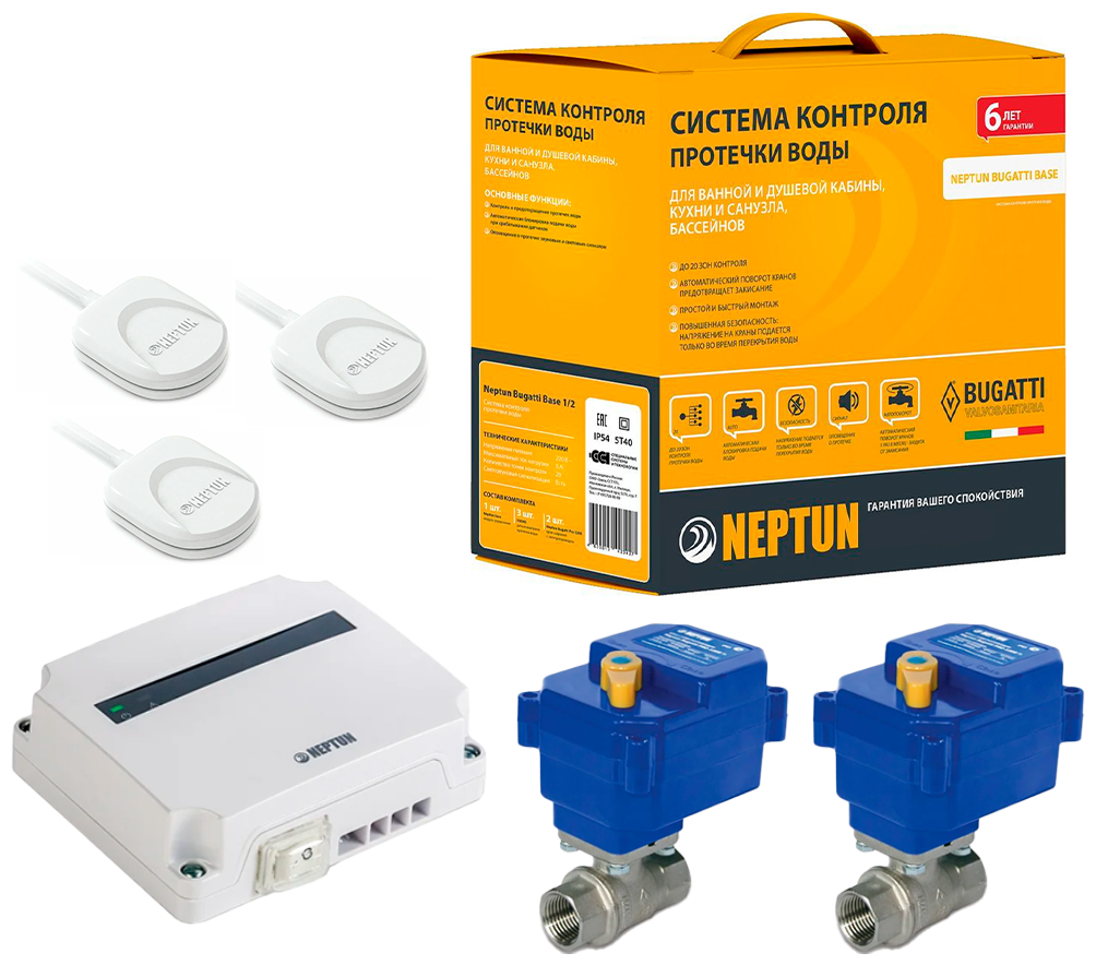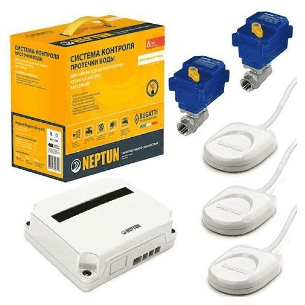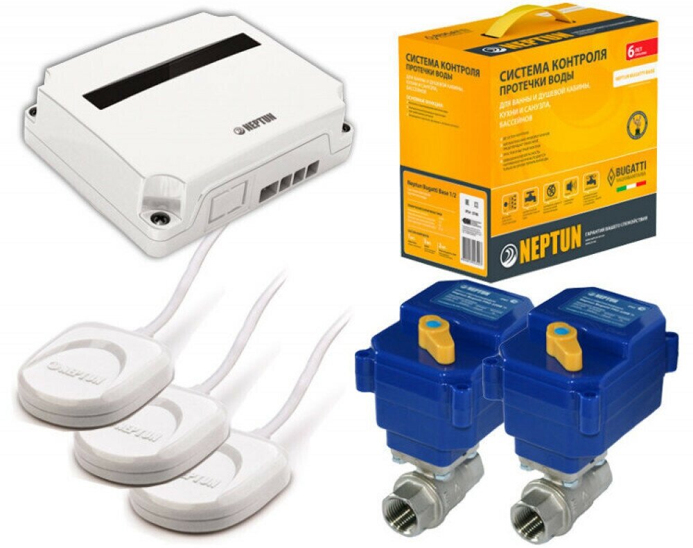 Neptun Base control module - 1 pc., wired water leakage sensor SW005 - 3 pcs., 1/2 ball valve with electric drive Neptun Bugatti Pro 220V series - 2 pcs., instructions