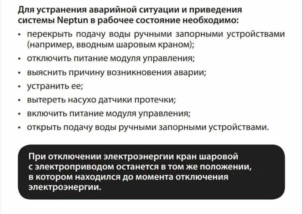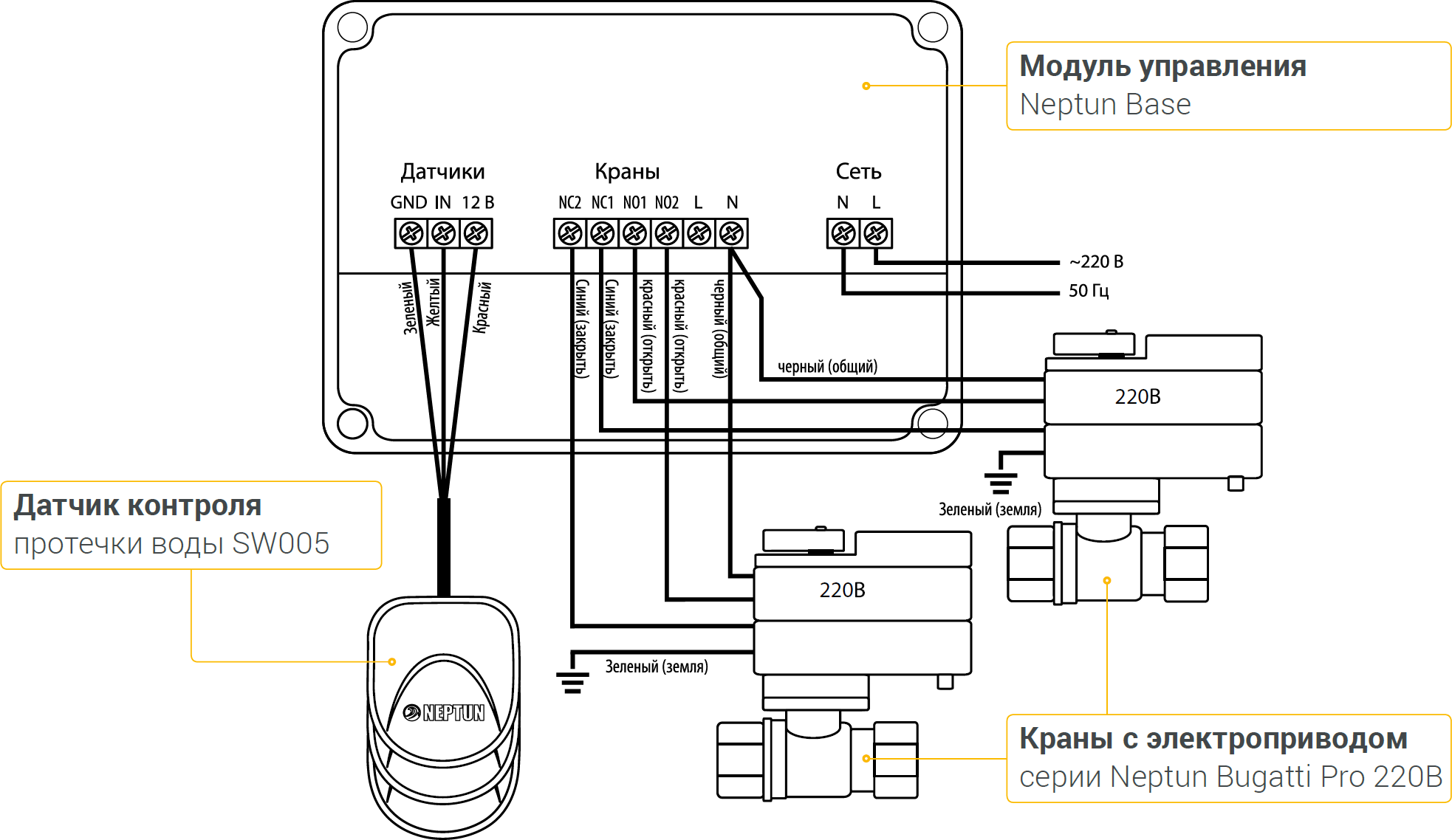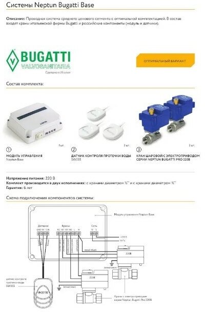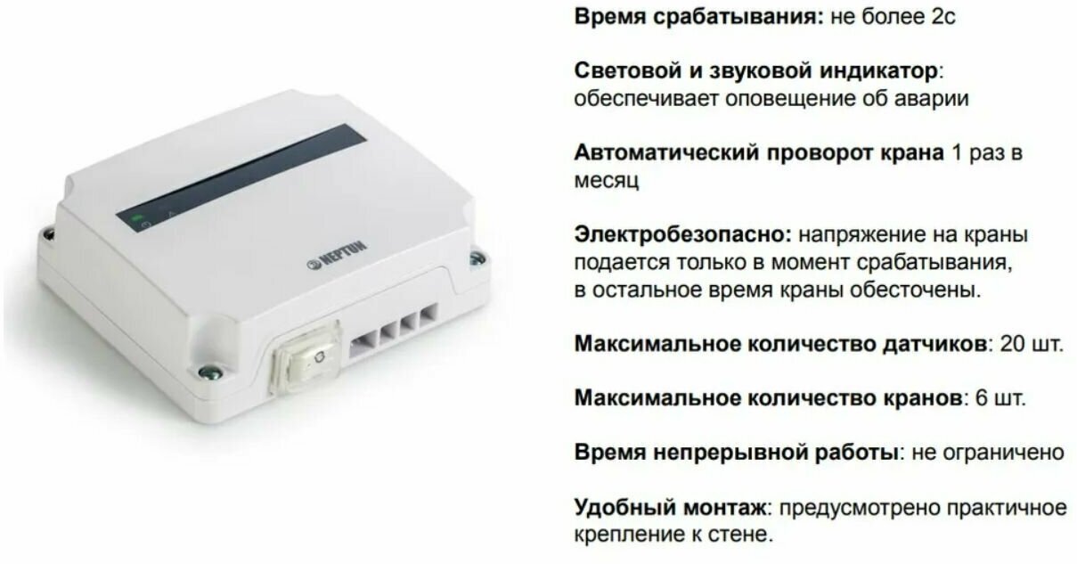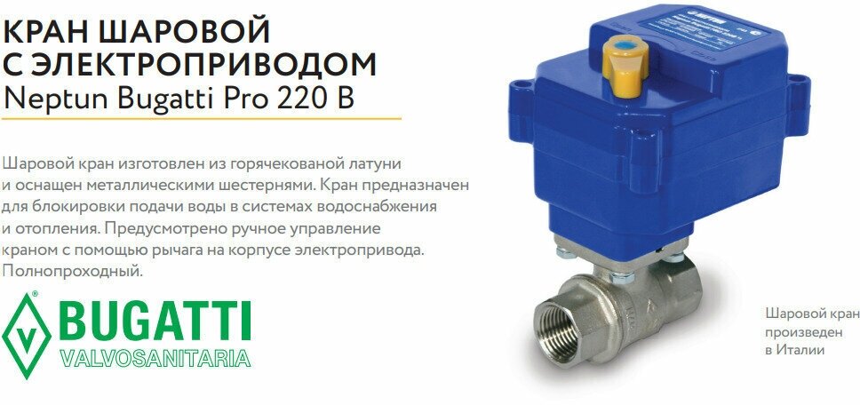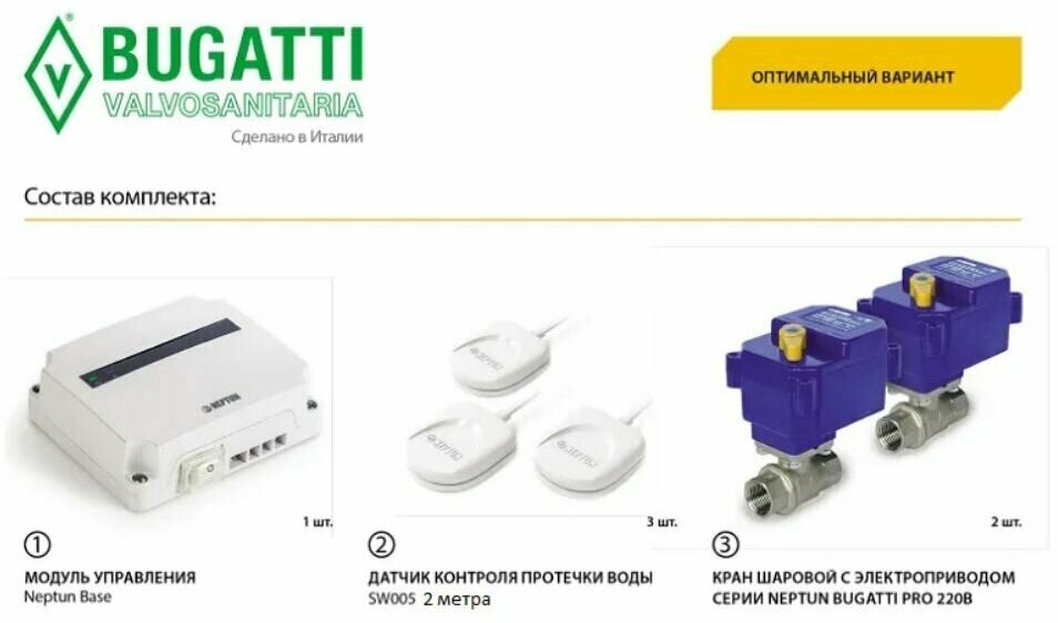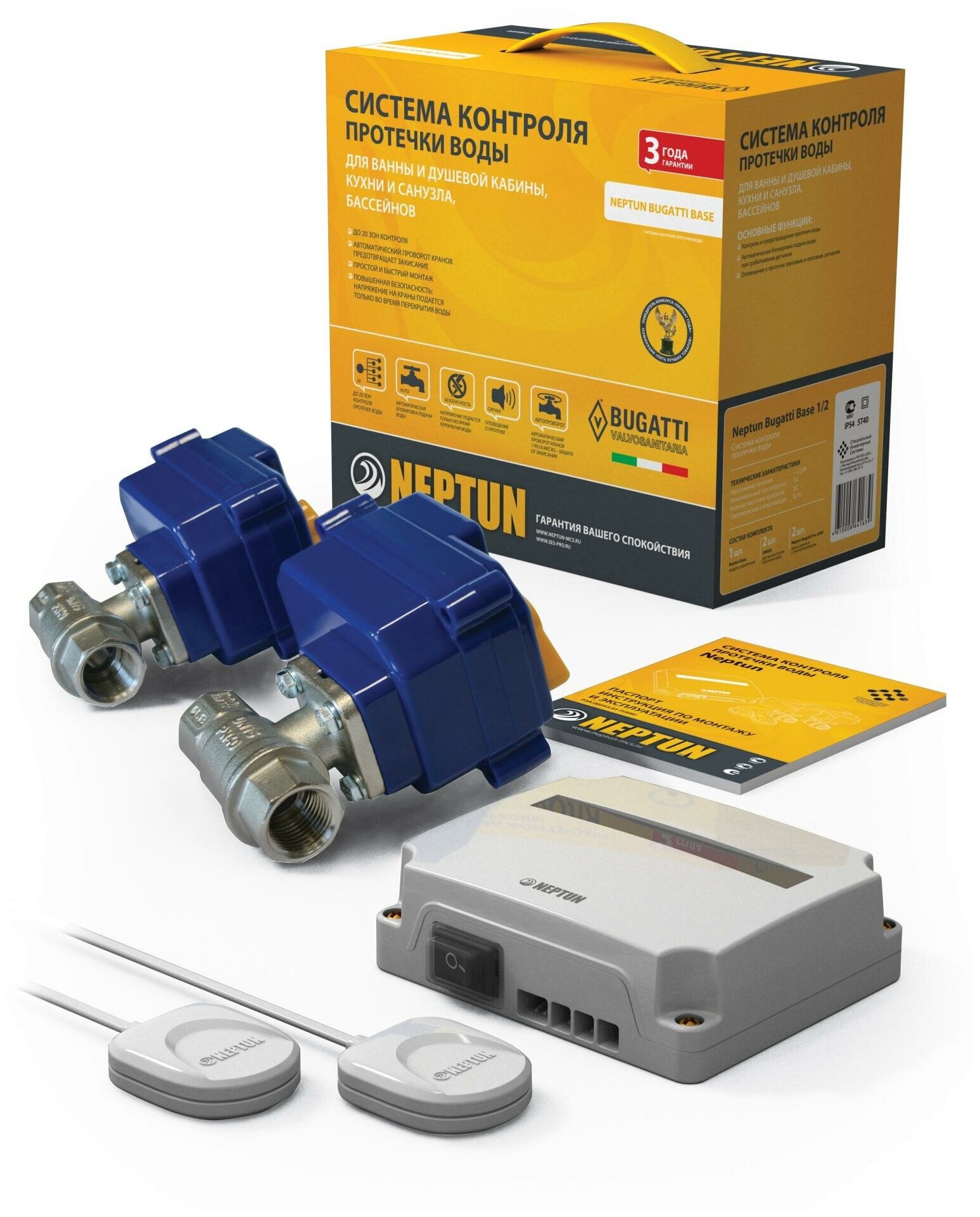 Neptun Base control module - 1 pc., wired water leakage sensor SW005 - 3 pcs., 1/2 ball valve with electric drive Neptun Bugatti Pro 220V series - 2 pcs., instructions
