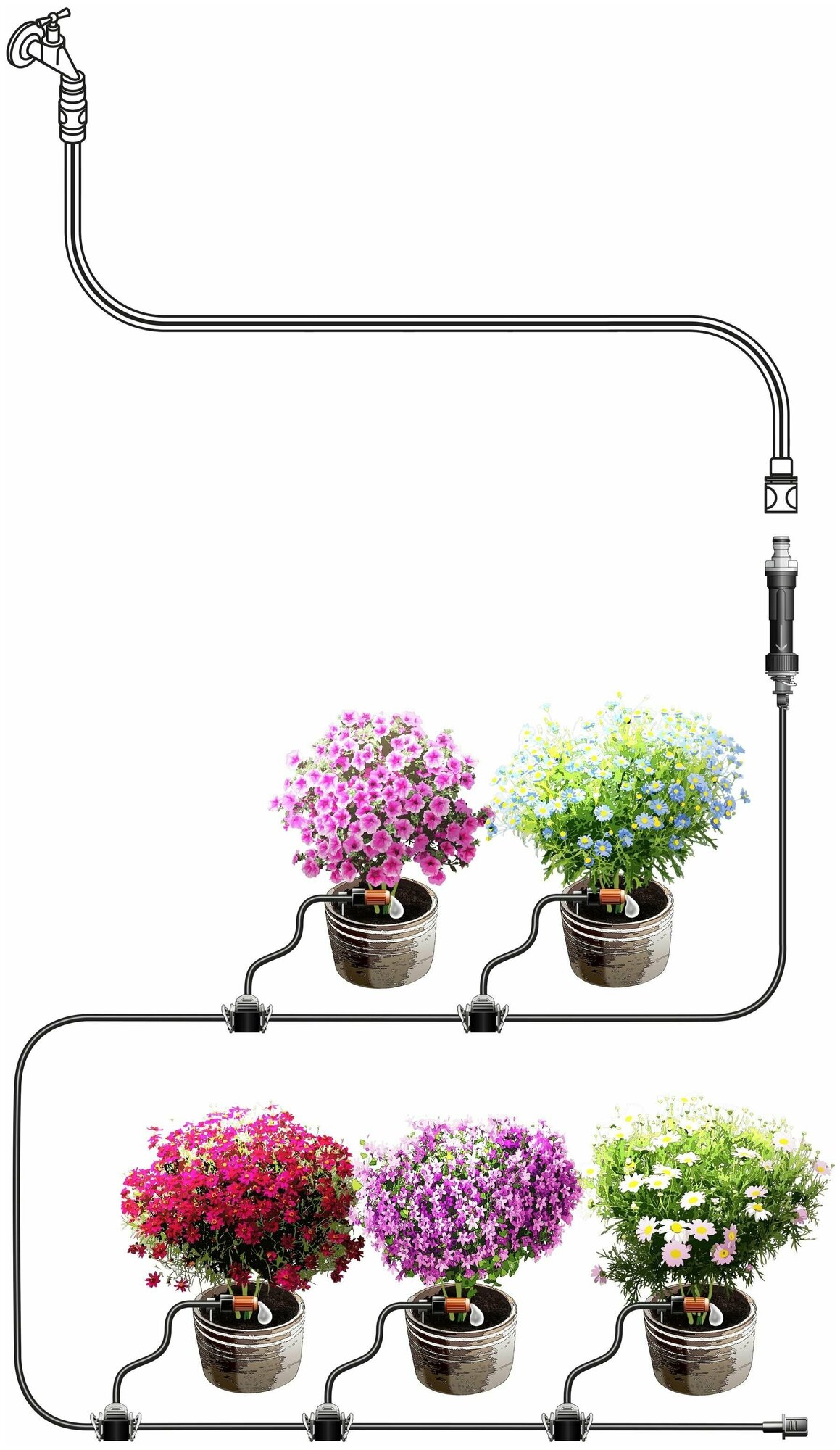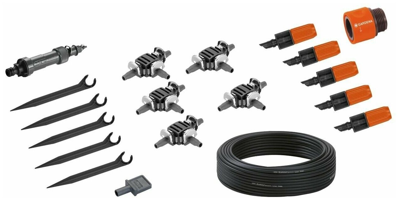 Master block 1000 - 1 pc, hose adapter - 1 pc, supply hose 10 m - 1 pc, hose pegs 4.6 mm 3/16" - 5 pcs, T-connector 4.6 mm 3/16" - 5 pcs, cap 4.6 mm 3/16" - 1 pc, adjustable end drippers 0-10 l/h - 5 pcs